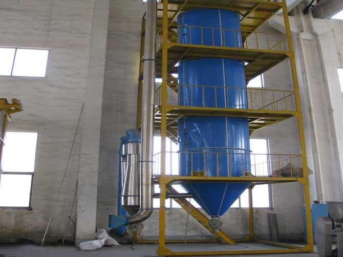 噴霧干燥制粒機(jī)的工作流程是通過(guò)隔膜泵高壓輸入料液,隨后噴出霧狀液滴,然后與熱空氣一起并流下降,塔底排料口會(huì)收集大部分的粉粒,旋風(fēng)分離器會(huì)分離產(chǎn)生的廢氣和微小粉末,廢氣之后會(huì)被抽風(fēng)機(jī)抽出,粉末會(huì)被設(shè)在旋風(fēng)分離器下的授粉筒收集,風(fēng)機(jī)的出口還裝備了二級(jí)除塵裝置,這保證了回收率在96%以上。