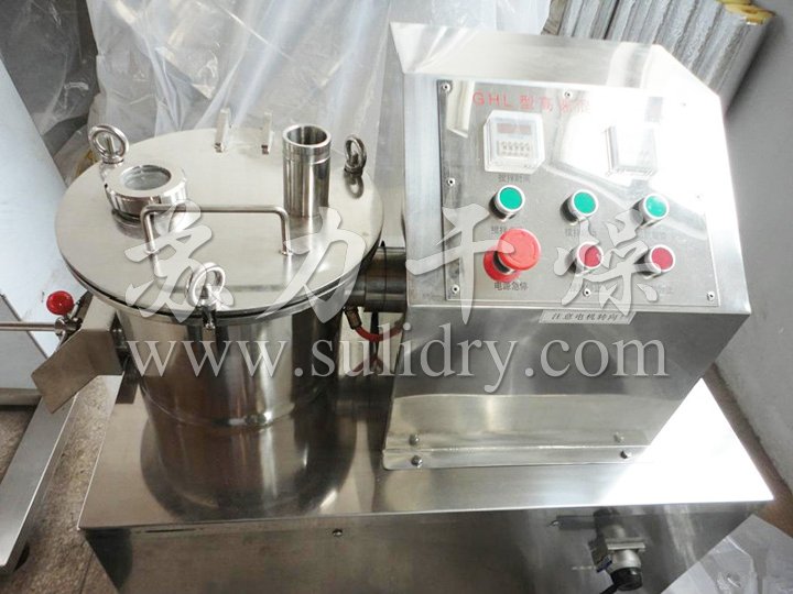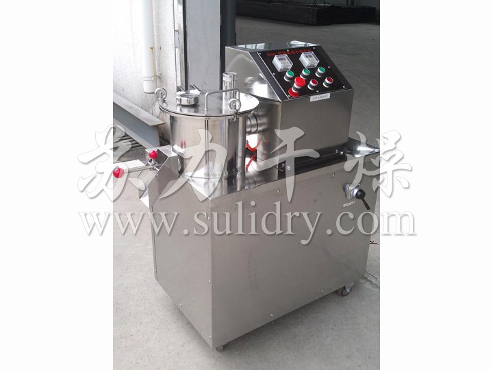 粉體物料與粘合劑在圓筒形容器中由底部混合漿充分混合成濕潤軟材,然后由側(cè)置的高速粉碎槳切割成均勻的濕顆粒。